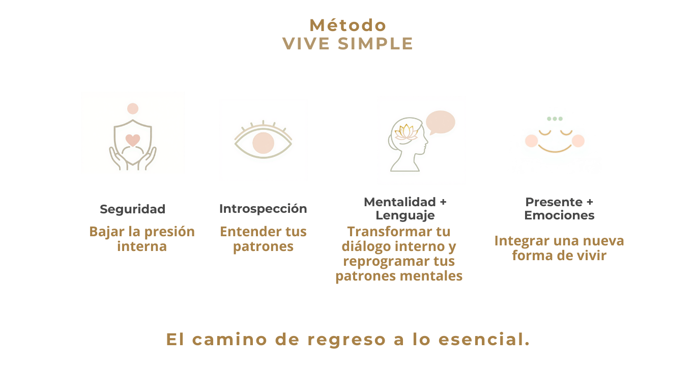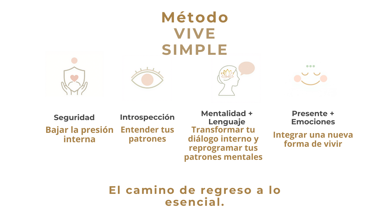 El método Vive SIMPLE es un proceso estructurado en 4 etapas, diseñado para ayudarte a volver a lo esencial y liderarte desde tu poder: